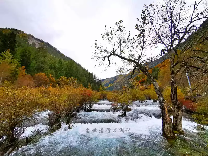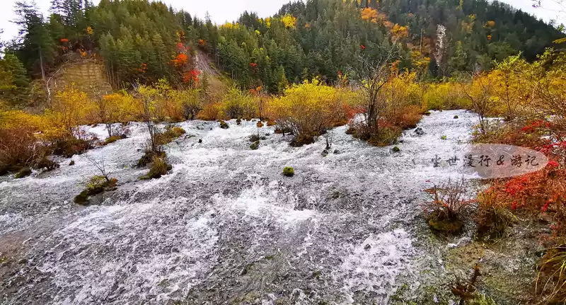 The river winds, The shrubs and miscellaneous trees on both sides are dyed with autumn colors, which is extremely gorgeous ......