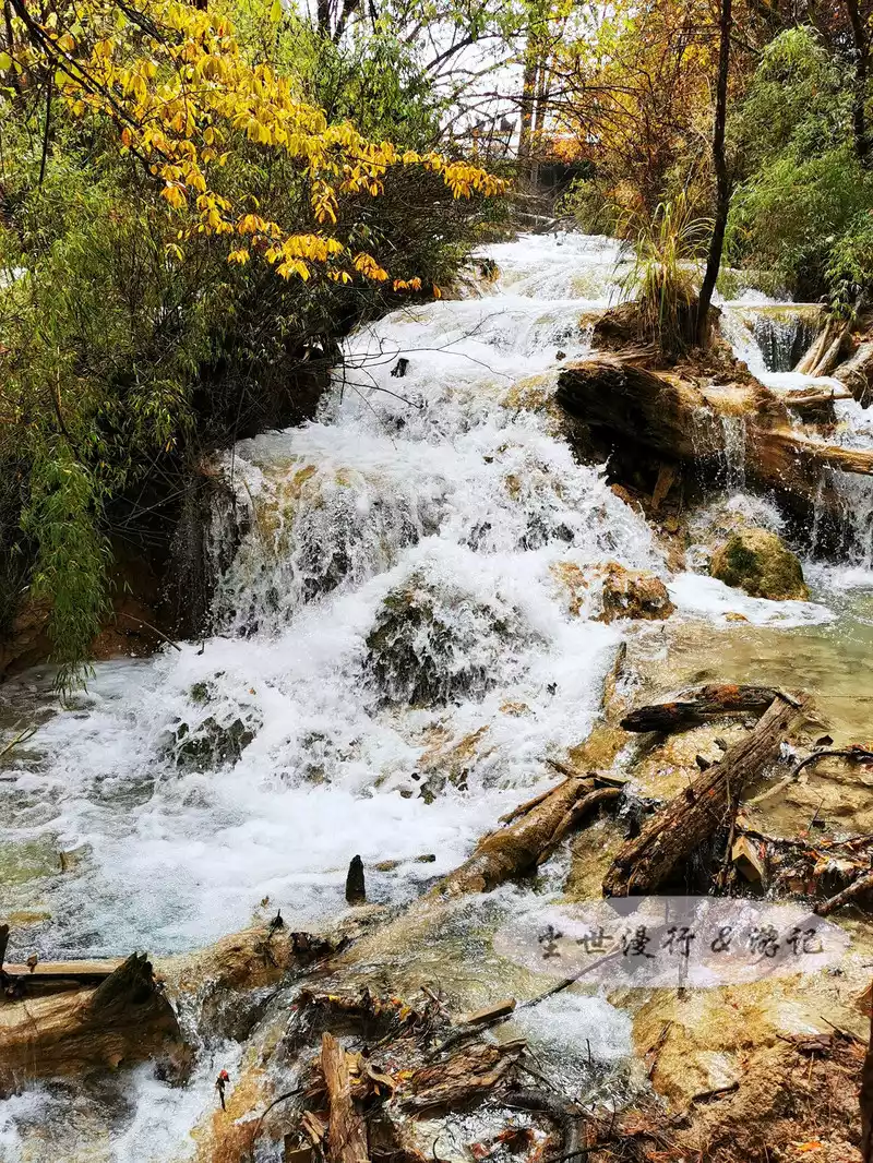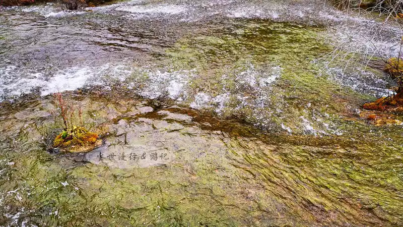 The beach surface of Pearl Beach is home to a large number of algae and water-loving shrubs dotted around. The water flow of about 100 meters falls into the river valley in multiple stages here, and due to the action of "biological karst" and chemical deposition in the flowing water, the beach surface is scaly and rippled, and the clear torrent splashes countless broken waves on it, dazzling and dazzling under the refraction of light, like rolling pearls.
