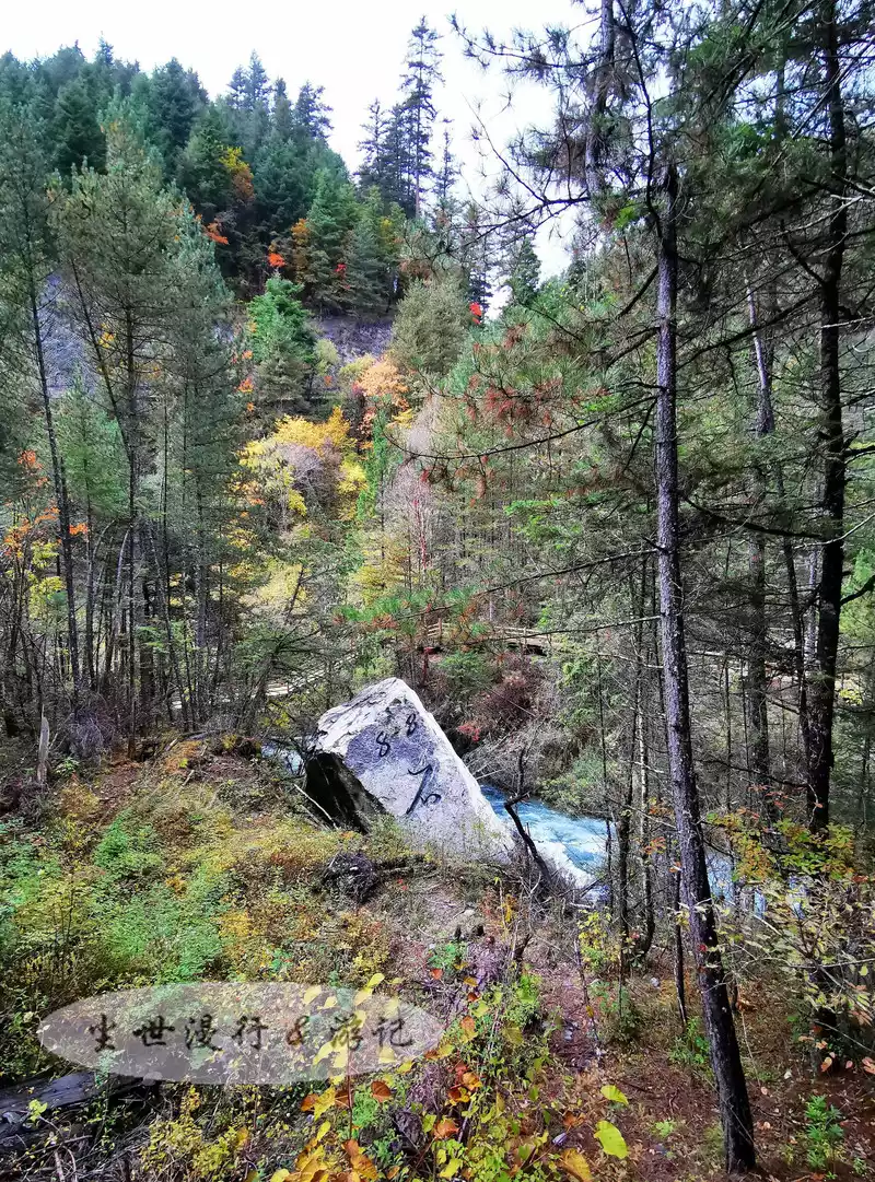 There is a "8.8 stone" in the woods next to the plank road, remembering a piece of history: at 21:19 on August 8, 2017, a magnitude 7.0 earthquake occurred in Jiuzhaigou. The earthquake caused a high-level collapse, and the boulder rolled from the mountain at an altitude of 2,654 meters into the river valley, with a vertical drop of 272 meters. The stone is 9.2 meters high, 163 cubic meters, and weighs about 522 tons, and is dolomite limestone, formed in a marine environment of 320 million years, which has witnessed the vicissitudes of Jiuzhaigou. The earthquake caused the boulders to break away from the mountain and roll down, destroying the vegetation along the way and forming a huge trench.