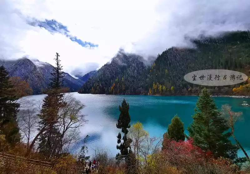 Paced down the wooden plank road next to the observation deck and came to the pool of ink jade.Watching the long sea up close, I feel that the lake surface is as wide as the sea, the lake ink is as green as jade, the white snow caresses the colorful forest, and the clouds are like a fantasy ......