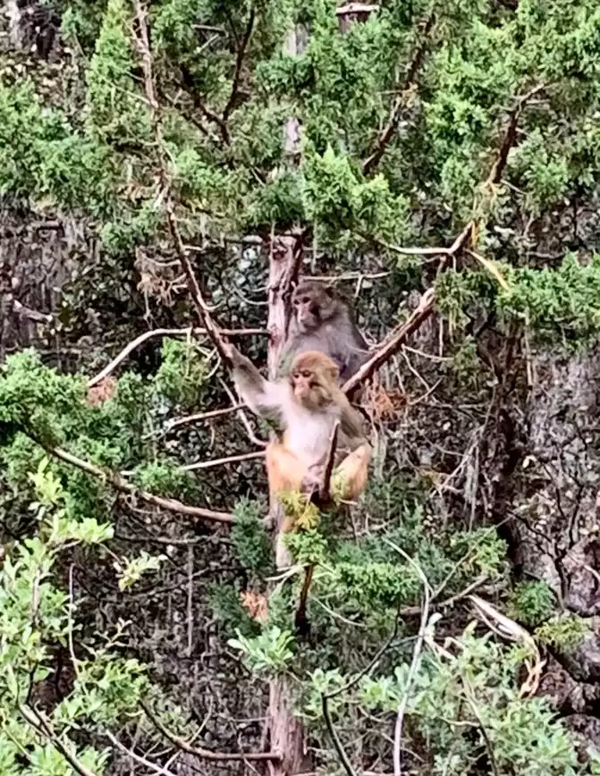 The monkey doesn't need to be talked about, passers-by keep throwing out the food in their hands, and the female monkey with the little monkey cub on her back is the most active, following all the way, eating endlessly.