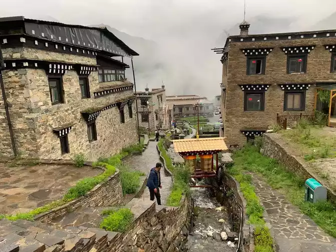 A small number of tourists have already walked on the ramp of the village, I saw the windmill spinning in the slope-shaped sink of the cottage, with the help of the power of the water flow, it seems that it will never stop, look closely, this is not a windmill, it is a prayer tube, tirelessly, from the moment I stood here, it has been turning, never stopped.