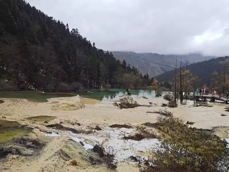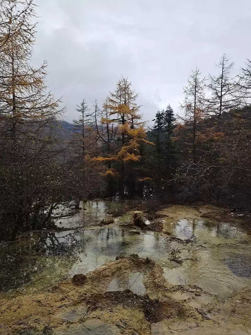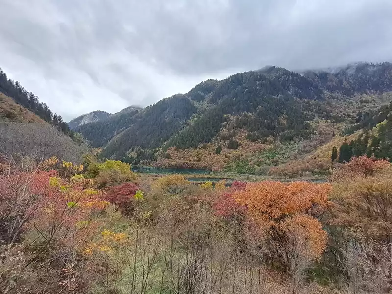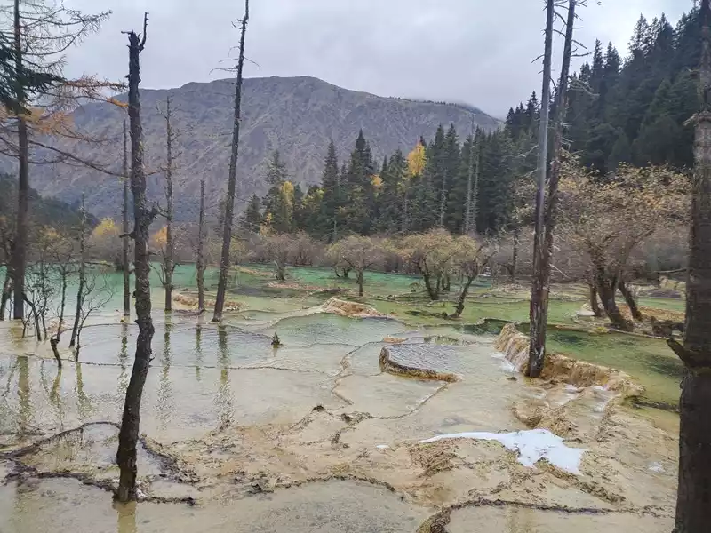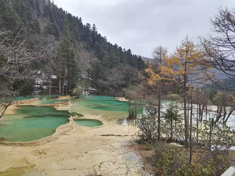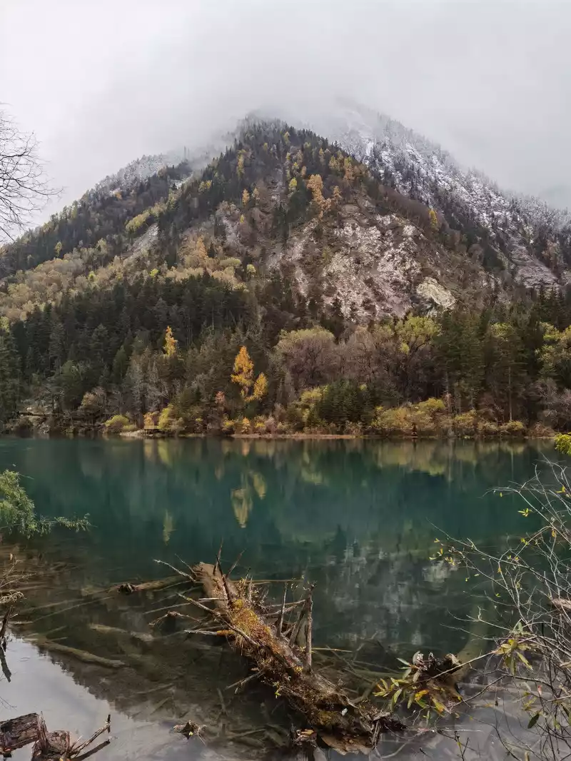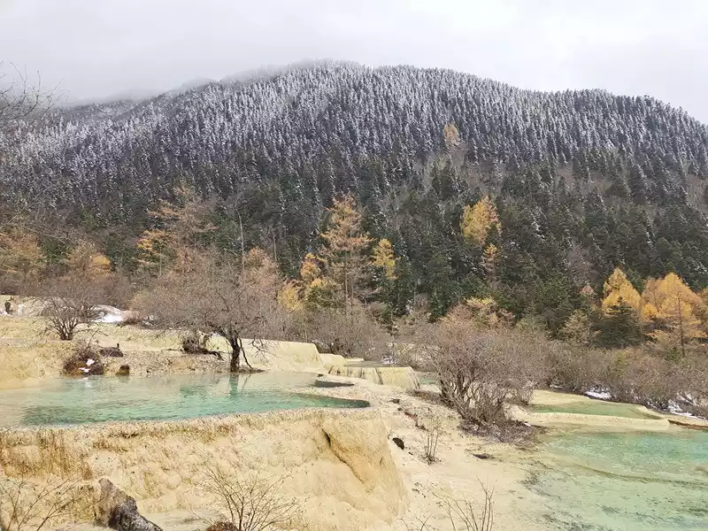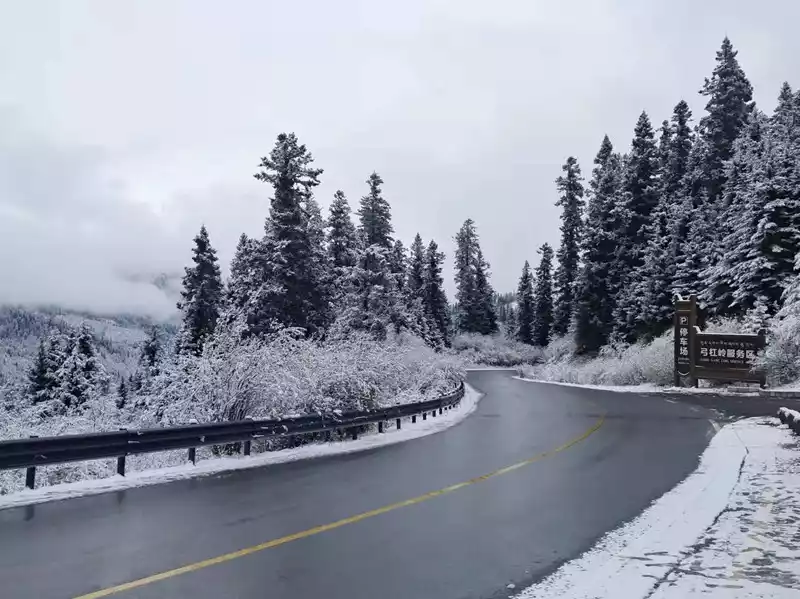 At seven o'clock at the end of October, Chengdu set off at dawn, and the driver chose the western route, going to Huanglong and Jiuzhaigou, with a total distance of about 430 kilometers. For a person who has lived in the east of the motherland for a long time. Everything is fresh along the way. Dujiangyan, Wenchuan, Maoxian, where the mountains still have traces of earthquakes, the continuous mountains, and even the shiny snow on the top of the mountain. It is worth mentioning that after lunch, the driver reminded that the down jacket in the suitcase should be taken out, and with the sudden rise in altitude, the temperature plummeted, and snowflakes could gradually be seen. Some people even have altitude sickness, which needs to be prevented. We arrived at Huanglong Scenic Area at around three o'clock in the afternoon, and we could eat and stay near Chuanzhu Temple, and the price would not be very expensive.