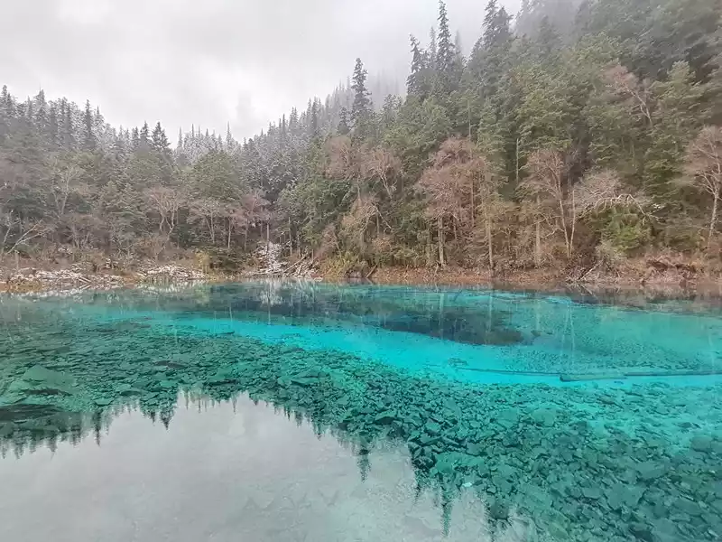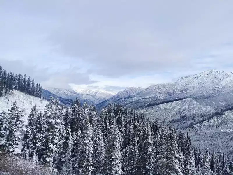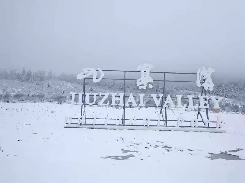 The journey from Chuanzhu Temple to Jiuzhaigou Scenic Area is about 2 hours, and it will pass through the forest reserve, due to the heavy snow the night before, the woods, snow-capped mountains are also particularly magnificent with the scenery along the way. For me, who lives in the east of the motherland, before I arrived at Jiuzhaigou, the scenery along the way was deeply attracted to me, the endless snow-capped mountains, the dense primitive deep forest. In the south at the end of October, the sun is still shining, and at the end of October and the beginning of November, Jiuzhaigou seems to have been overturned by the color palette of heaven, colorful, and snowflakes fall from time to time.