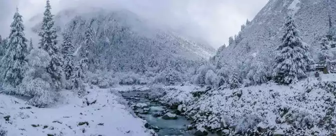 Forests, snow-capped mountains, streams, alpine meadows, and alpine calcified flow pools are the characteristic landscapes here, and the snow-covered meadows are distributed in the primeval forest, surrounded by undulating mountains, or steep and upright, or tortuous and winding.