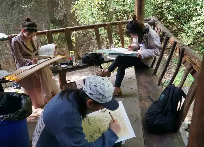 ▲ Students from the art school concentrate on sketching