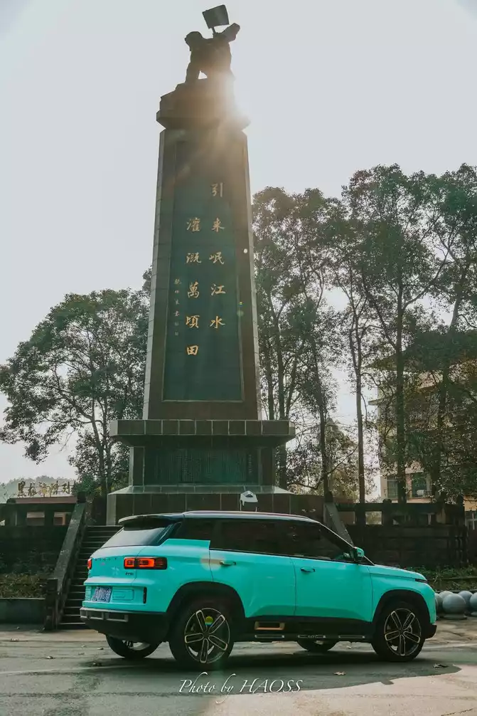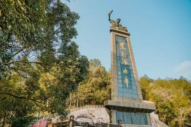 Follow the navigation all the way to Heilongtan Reservoir, which is the core center of Heilongtan Scenic Area. There is a triangular pagoda monument standing here, and at the top of the monument is a statue holding an anvil to beat stones to commemorate the people who dedicated themselves to the construction of the reservoir, and the monument body is inscribed by Guo Moruo.
