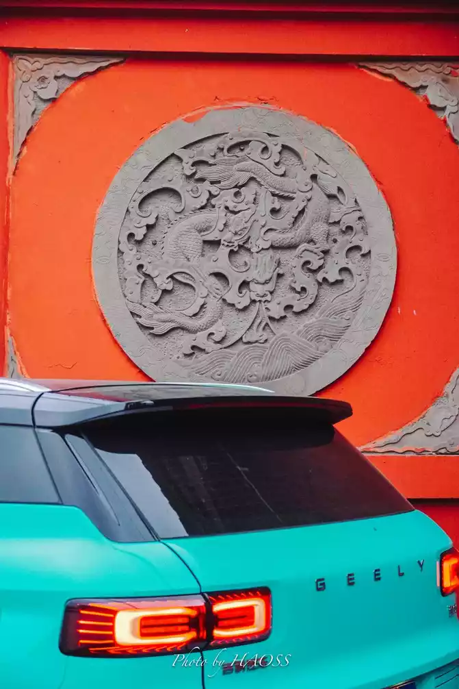 Driving the Geely icon on the edge of the red wall outside the ancestral hall, the red wall tiles full of history and the candy-colored body of the fashion trend collide with each other, like the harmony of contradictions like contrasting colors, and there is also the interweaving and collision of ancient and modern and history.