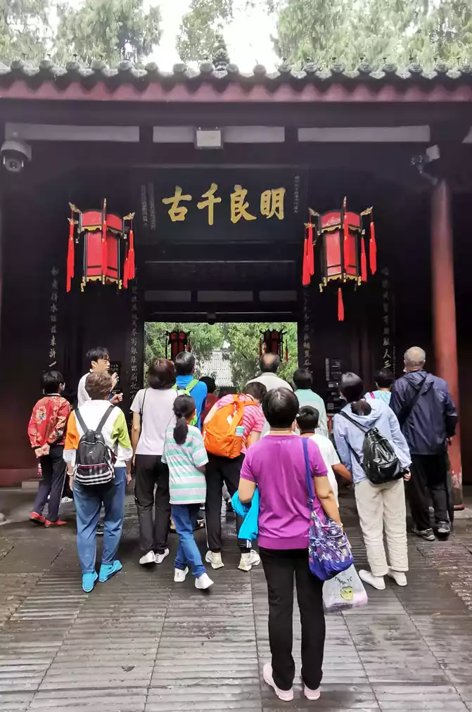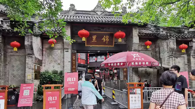 From the south gate of Jinli to the exit located outside the northwest corner of the Wuhou Temple, facing Liu Xiang's tomb, but the direction of the tour is reversed: the tomb - Xiangdian - Monument Pavilion - Que Fang - Gate.