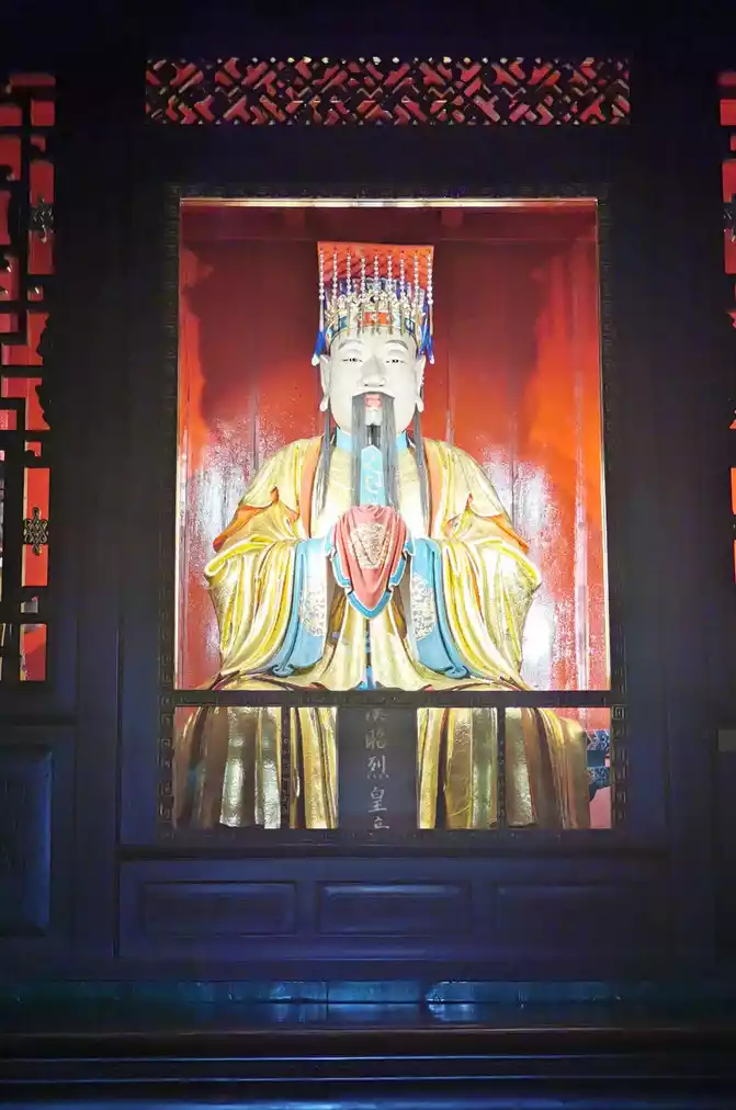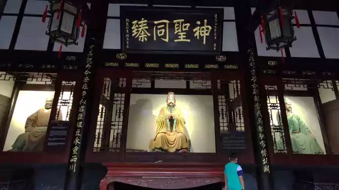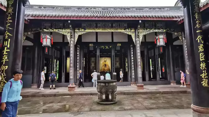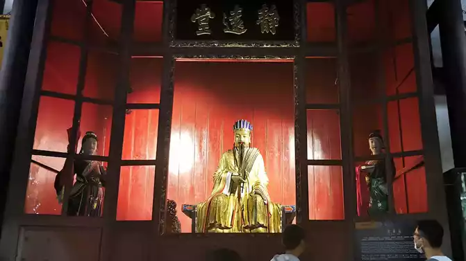 Liu Bei Hall, located inside the second gate, is magnificent. In the center is a gilded statue of Liu Bei, and on the left is a statue of his grandson Liu Chen. On the right side, there was originally a statue of his son Liu Chan, who was moved out during the Song Dynasty because of his mediocrity and incompetence, loss of power and humiliation of the country. On both sides, there are statues of Guan Yu and his son and Zhou Cang in the east, and statues of Zhang Fei's ancestors and grandsons in the west.