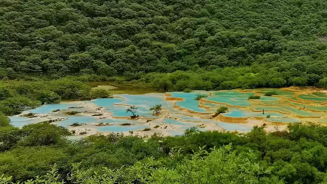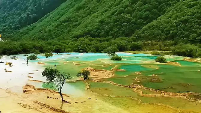 这些钙华滩连绵分布长达3千6百多米,最长的一段有1300米,最宽处170米。从高处看,宛如一条巨龙,从岷山雪峰飞腾而下,蜿蜒于茂林翠谷之中。黄龙沟的名字即来源于此。