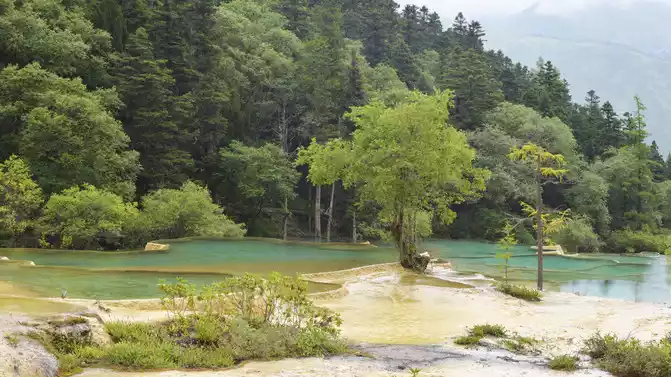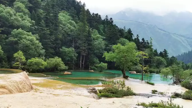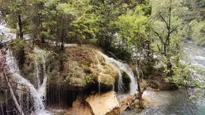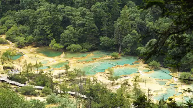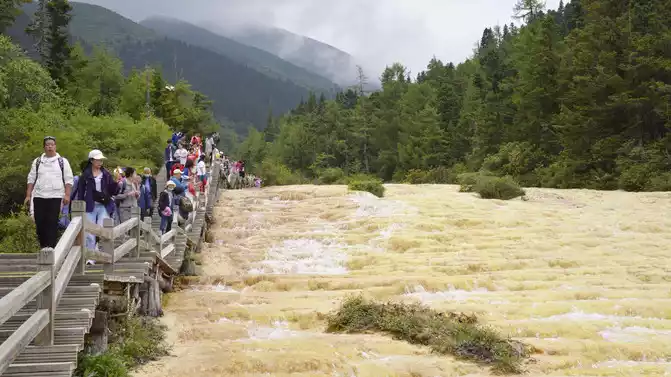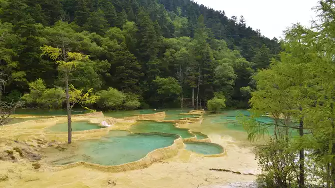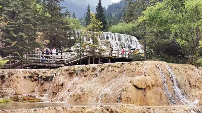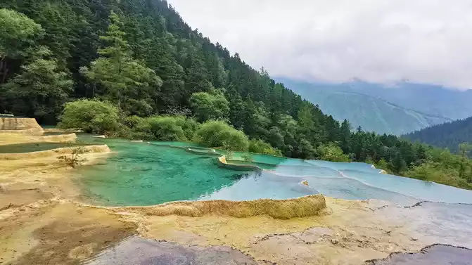 黄龙沟的看点一是钙化滩,二是彩池,三是瀑布。