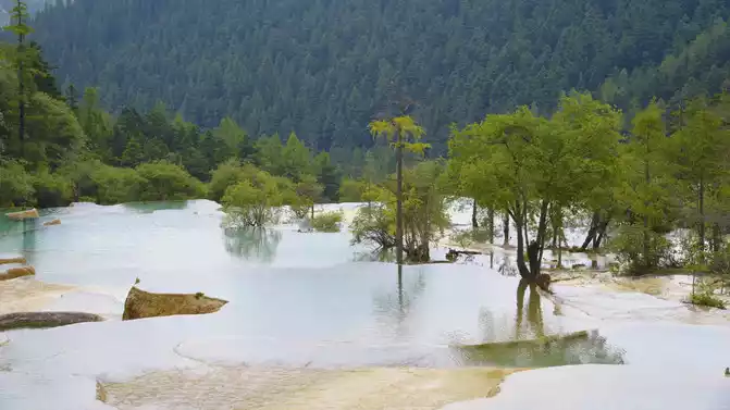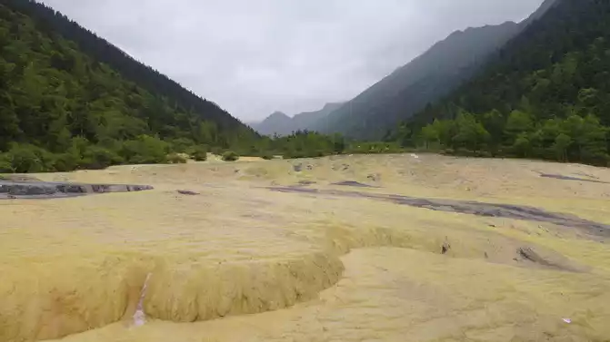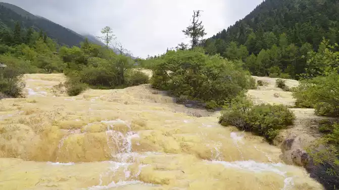 黄龙特殊的地质环境使雪宝顶的融雪水流富含碳酸钙,平缓的谷底岩石几乎全被凝结的碳酸钙覆盖,形成乳黄色的钙华滩.