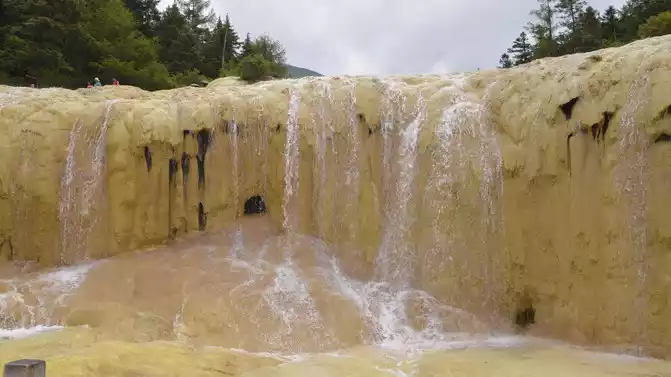 奔涌的水流从堤埂上翻越而下,在钙化壁上形成一道金碧辉煌的钙华瀑布,十分壮观,号称“飞瀑流辉”。“洗身洞”就位于钙化瀑布下部。