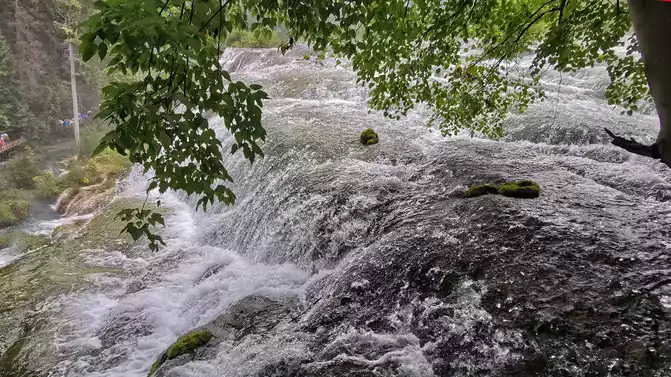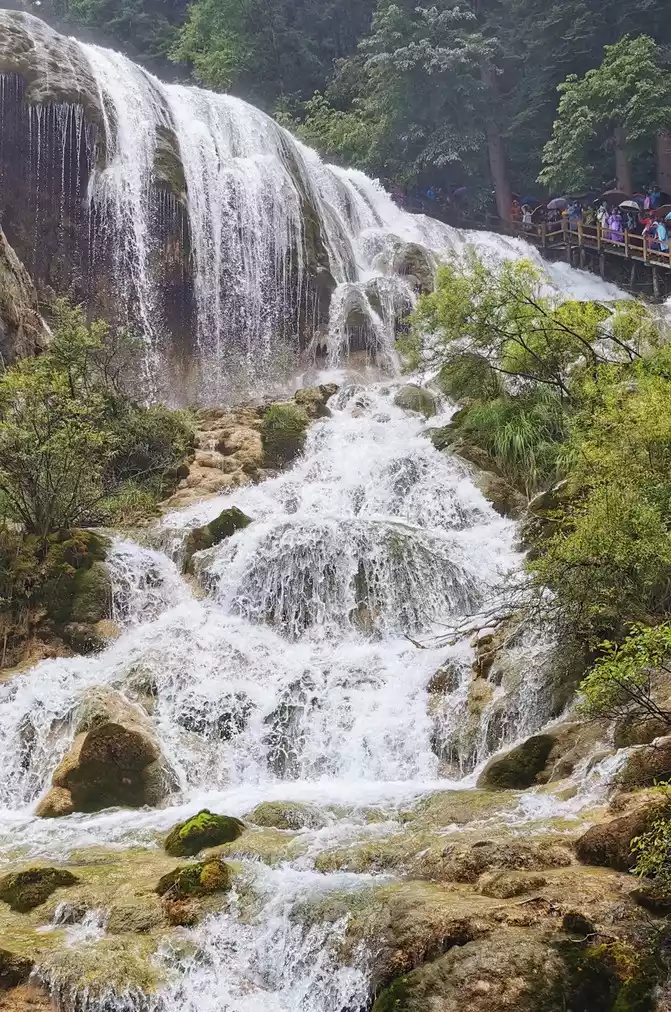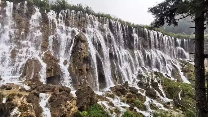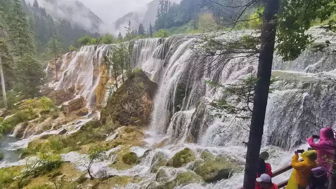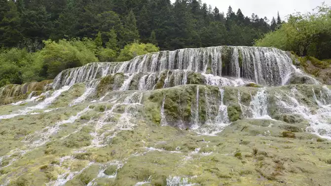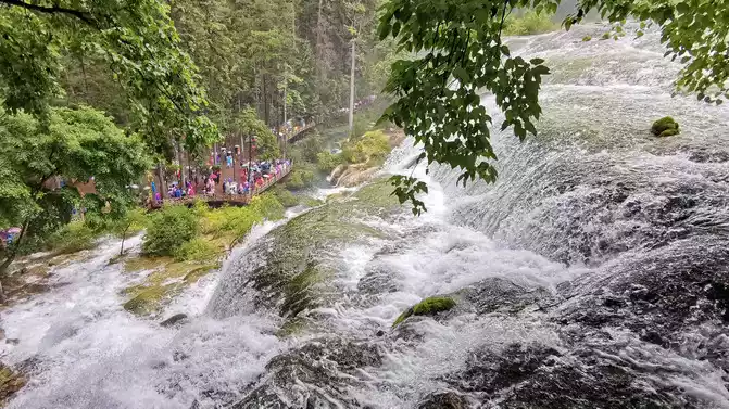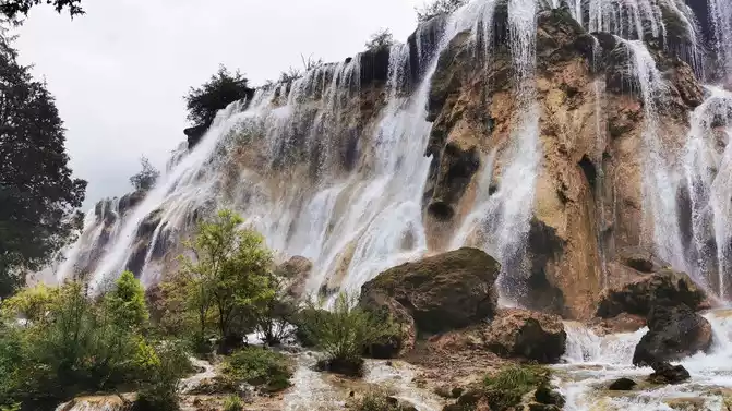 珍珠滩奔涌的水流从悬崖滚落而下,形成一道宽阔的新月形瀑布——珍珠滩瀑布,吼声震耳,水花飞溅,激流飞奔,是九寨沟水色最美、水势最急、水声最大的一段激流。