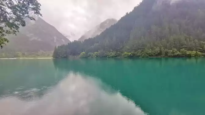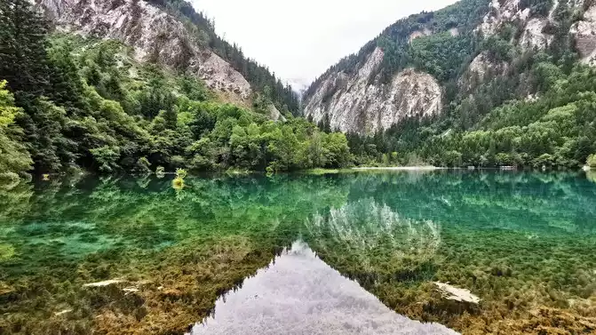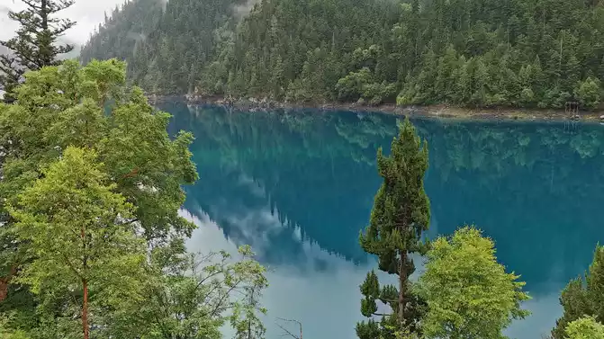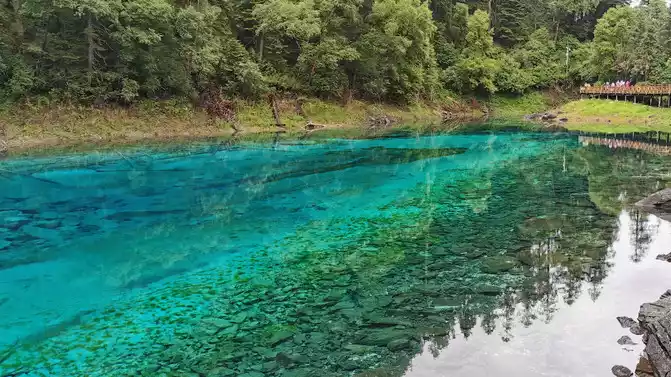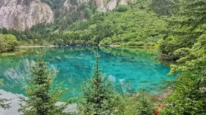 五花海,平静的湖水倒映着五彩的林木,颜色多样,五彩斑斓,故称“五花海”,为九寨之精华。