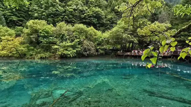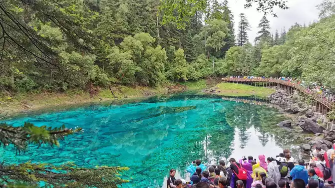 五彩池,位于长海的北边,以秀美多彩、纯净通透而闻名,是九寨沟最小、色彩最艳丽的海子。