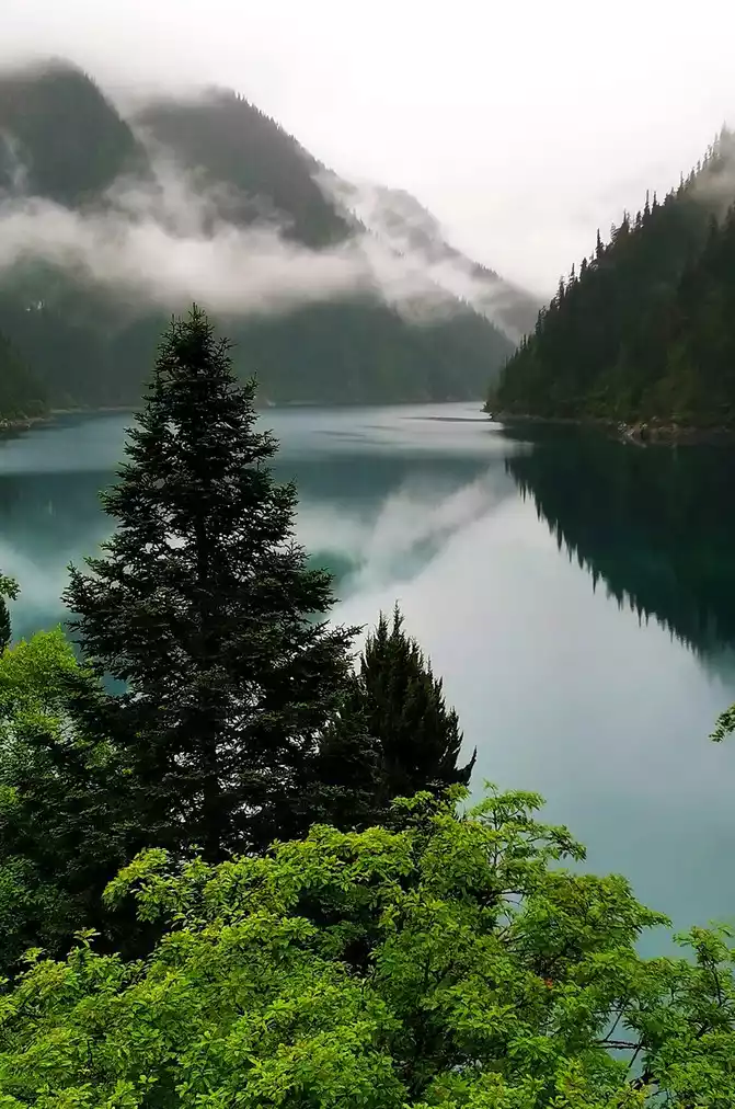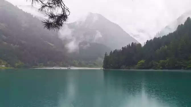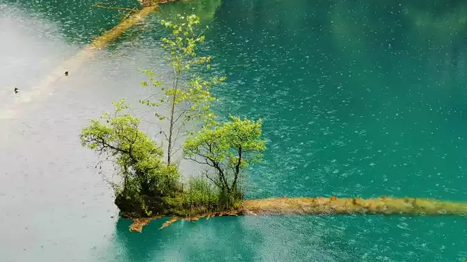 镜海四周被林木所围,细雨轻洒,水波微绉,波光粼粼,犹如幻境。