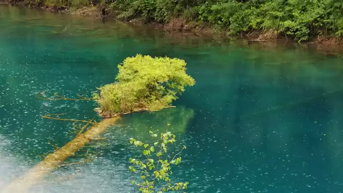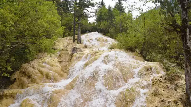珍珠滩,位于五花海下游,是一处坡度平缓的浅滩,水流在乳黄色钙华滩上溅起无数水珠,就像一片洁白的珍珠在流动,故而得名。