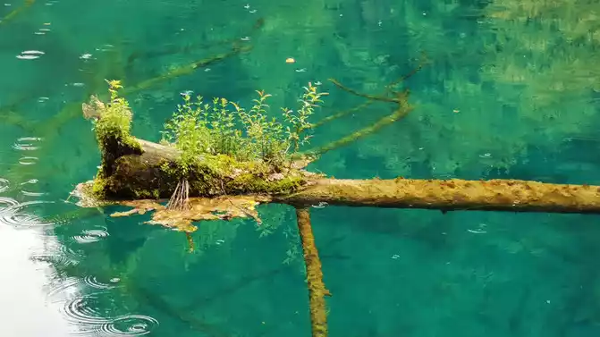 湖中倒伏的大树半浮半沉,半露的梢头竟然长出了灌木苔蕨,如盆景于湖中亭亭玉立。