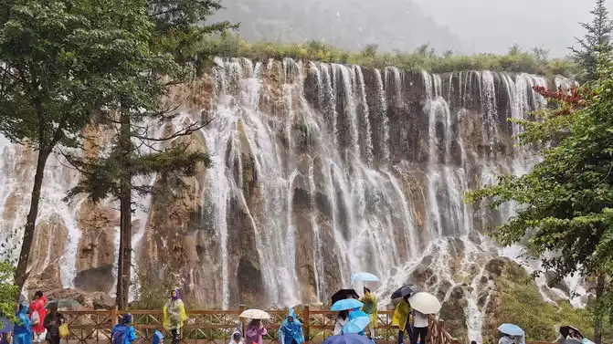 诺日朗瀑布,镜海的出水口。瀑布宽270米,高24.5米,是国内大型钙华瀑布之一。它多级下跌,宽阔的水帘直泻百尺山崖,波澜壮阔,气势宏伟。众多影视剧曾在这里取景,86版《西游记》的片尾也是在这里拍摄。