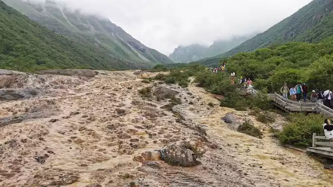 黄龙沟是岷山主峰雪宝顶下的一条峡谷,长3.6公里,下端入口处海拔3300米,上端沟头海拔3900米。谷底修有栈道,可徒步爬升600米到沟头再返回,需4个小时。高原上爬山自然不是我等所选,还是乘索道上山,沿栈道下行更为适合。