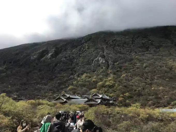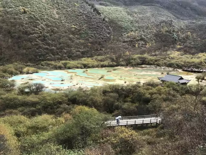 After passing Huanglong Temple, we are about to start climbing the mountain again, because we have to climb to the observation deck at a high point to overlook the colorful pond up close.Looking down at the colorful pool closer, you will feel that there is a golden dragon with green scales lying quietly in the autumn forest surrounded by mountains, absorbing the spiritual energy and essence of heaven and earth.