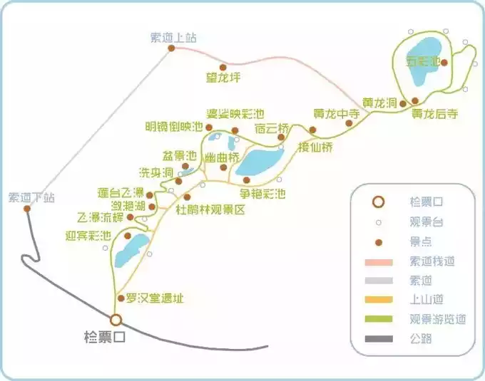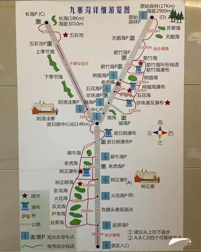 You can see the distribution of scenic spots from the map, but there are only 2 scenic spots in Zawagou: Changhai and Wucai Pond, which are relatively few, but Changhai is the largest lake in Jiuzhaigou and the mother lake of Jiuzhai, which is very open and huge; The colorful pond is also the most beautiful lake in my personal opinion, and the various colors are vibrant and colorful in the sun, so although there are few attractions, it is very distinctive.