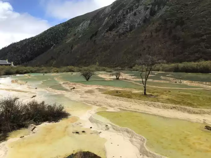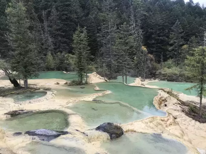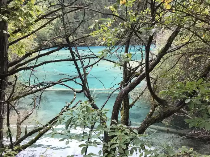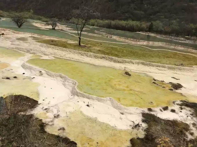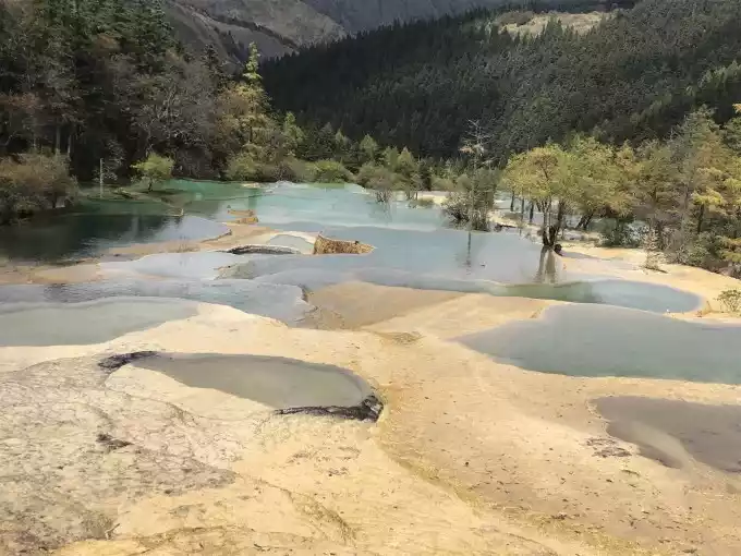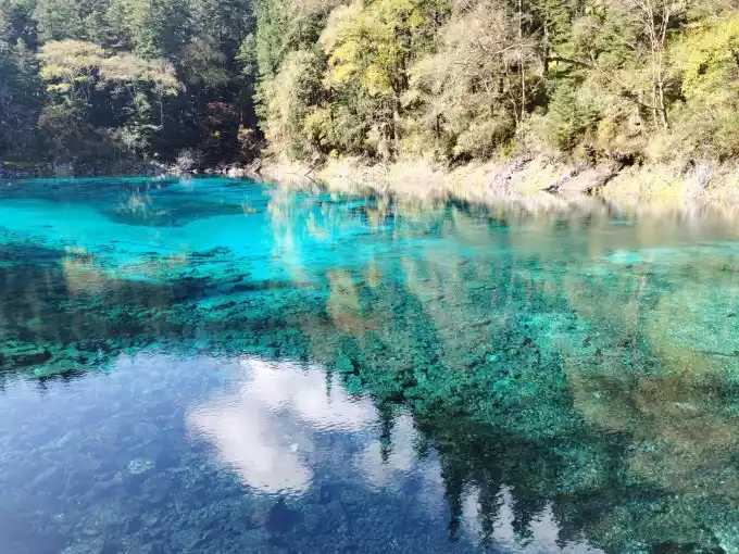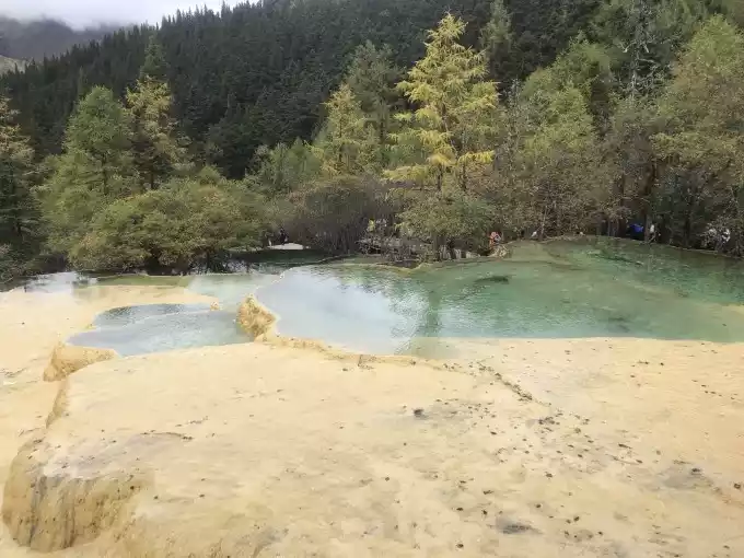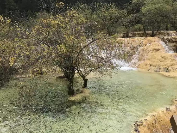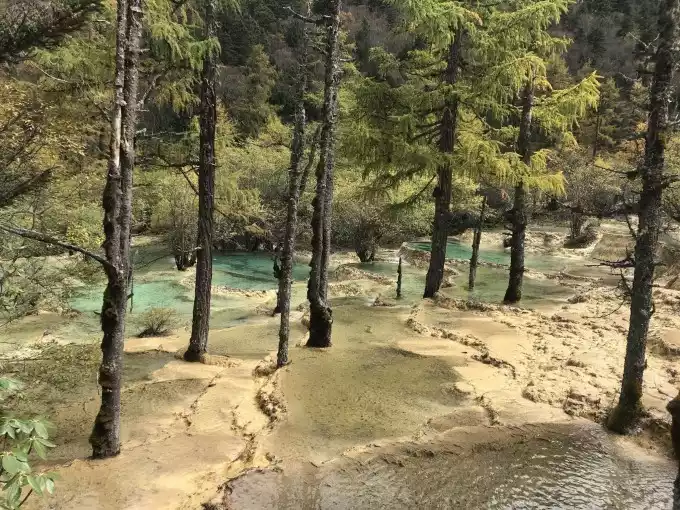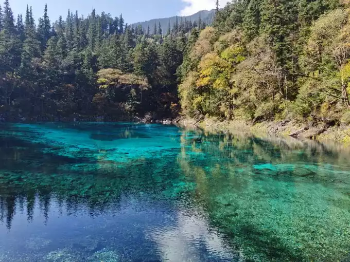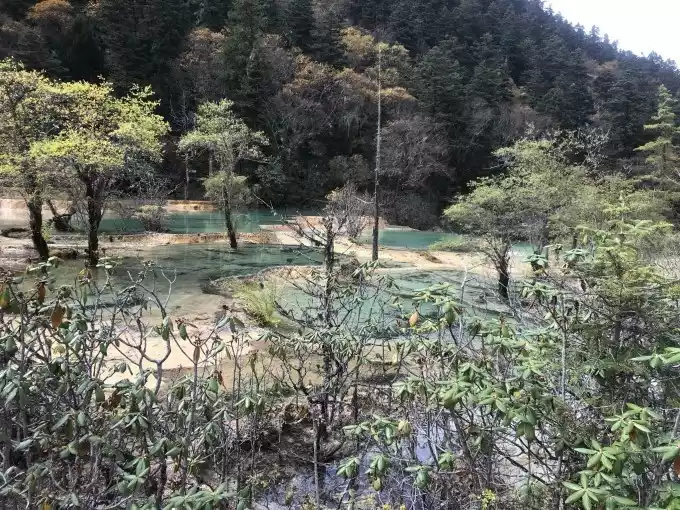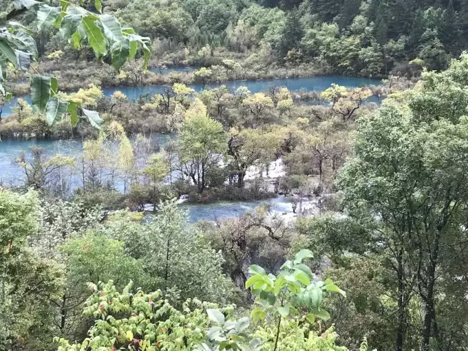The temperature of Huanglong may be lower than that of Jiuzhai, so the yellow color of Huanglong's leaves will be darker.