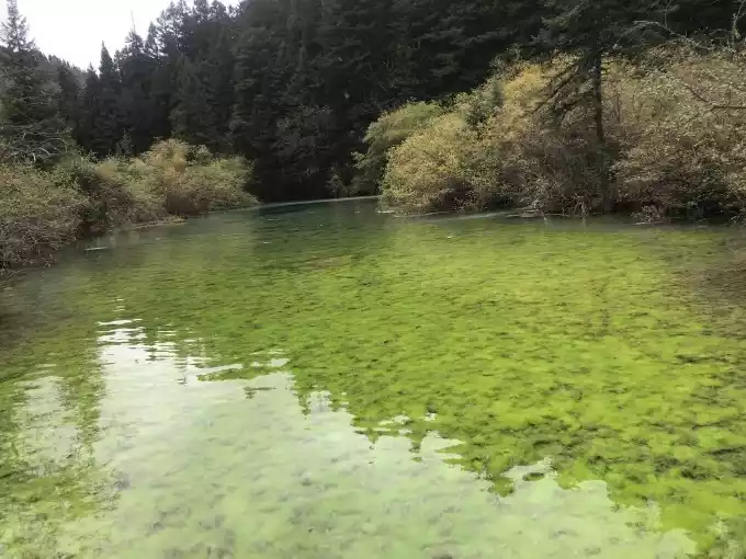 This is Weiyan Lake, and the lake is full of lush moss and algae, so the color is very rich and colorful, and the green is very bright.