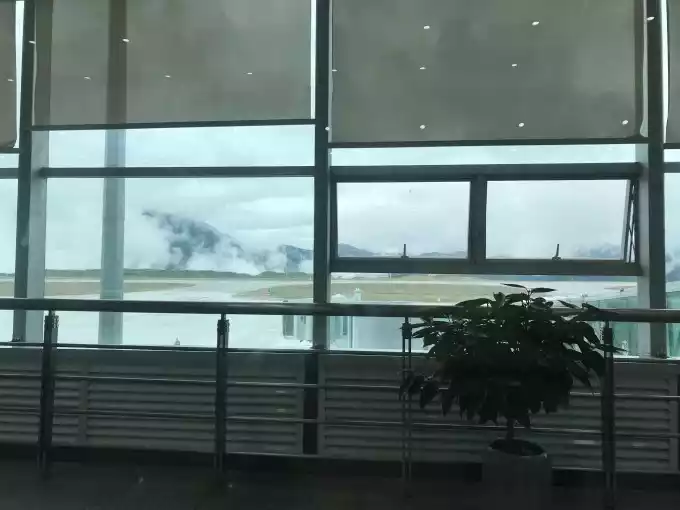 Through the glass windows in the terminal, you can see that the airport is also surrounded by clouds and mist.