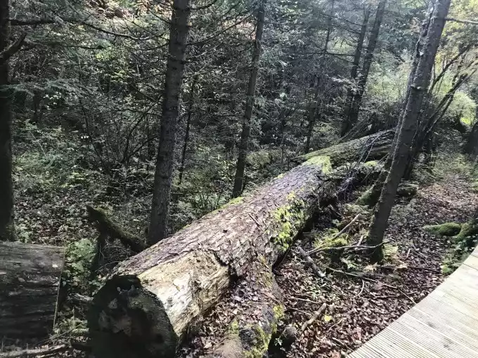 Walk from Changhai to the forest plank road of Wucai Pond, and see the tree trunk falling in the forest. Attached to fine moss. The sunlight that has been carefully sifted by the trees falls softly on the moss, which is particularly gentle.