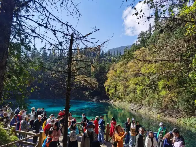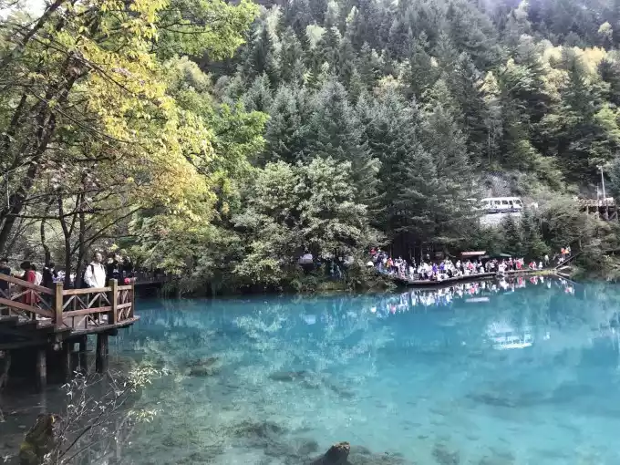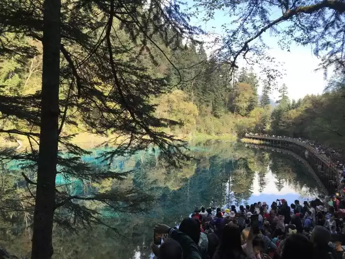 Because the colorful pond is relatively small, you can see that the surrounding plank road is already full of people.
