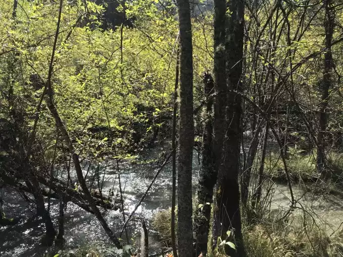 Continue walking and come to the Moon Reflection Pool. The gurgling spring flows down and diverts into a thin "mask" of water on the wider tidal flats, rushing down through the low trees.