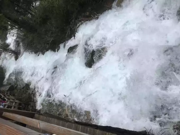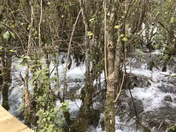 There are many attractions along the way, among which Wuhuahai and Pearl Beach Waterfall are treasure check-in points, I went to Wuhuahai the next day, the weather is not good, so the viewing effect is much worse than the first day in the colorful pool, but the Pearl Beach Waterfall is really beautiful, along the way there are big pearls and small beads falling on the jade plate, not to mention the 87 version of "Journey to the West" opening "You carry the burden, I lead the horse" is from the Pearl Beach Waterfall, as a loyal fan of the 86th version of "Journey to the West", I really remember this scene. Then I think that if you have enough time, you must hike this section of the wooden plank road in the forest from the primeval forest to the Arrow Bamboo Sea Waterfall, and you can see the sea of swans and the sea of grass along the way, which is really very beautiful and must be in it. The Arrow Bamboo Sea Waterfall is a bit similar to the sea of trees, all of which are water flowing through the forest, which is very distinctive.