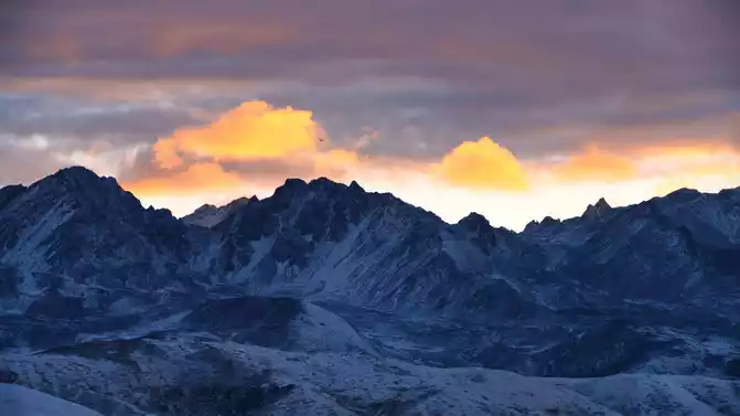 At the top of Niubei Mountain Camp, the mountain was shrouded in fog due to snow. Sitting in the camp, we quietly waited for sunset.