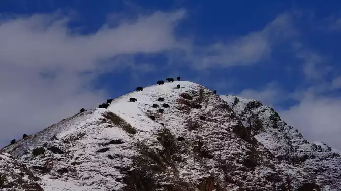 The yak climbed to the top of the mountain, and the snow-capped mountains were right in front of you and at your feet.