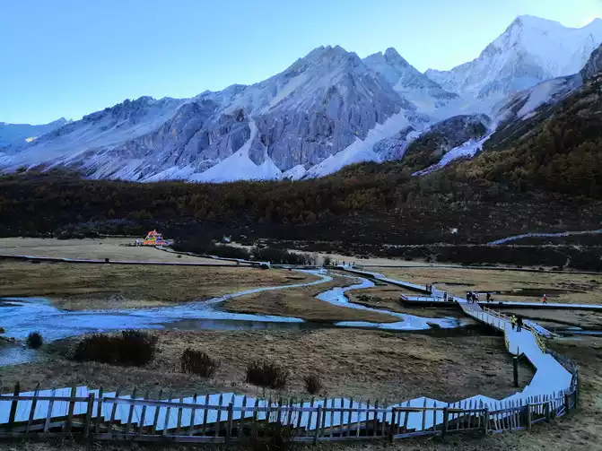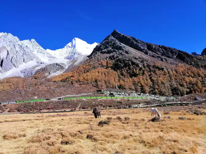 I got up at 6 o'clock the next day, had breakfast, took the sightseeing bus at half past 7 o'clock to Zha Guanben, then walked to Chonggu Temple, took the battery car to Luorong Cattle Farm, and Chonggu Temple to Luorong Cattle Farm 6.7 kilometers, 40 minutes round trip. The Luorong Cattle Farm in the morning is quiet, peacefully welcoming the rising sun, your sea, my mulberry fields, are all here. The handsome and dashing Yangmai Yongshen Mountain watched the Gongga silver sea flow by at the end of the cattle farm, and the youth was flying; The upright Xiano Dorji is silently guarding in the east.