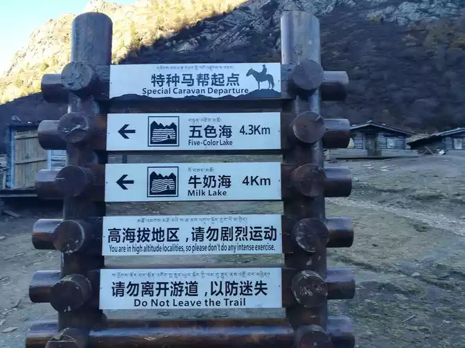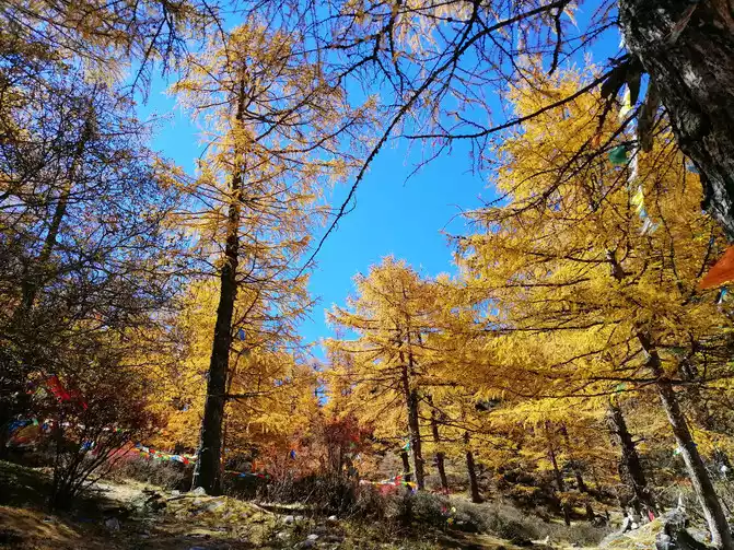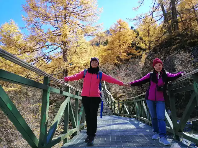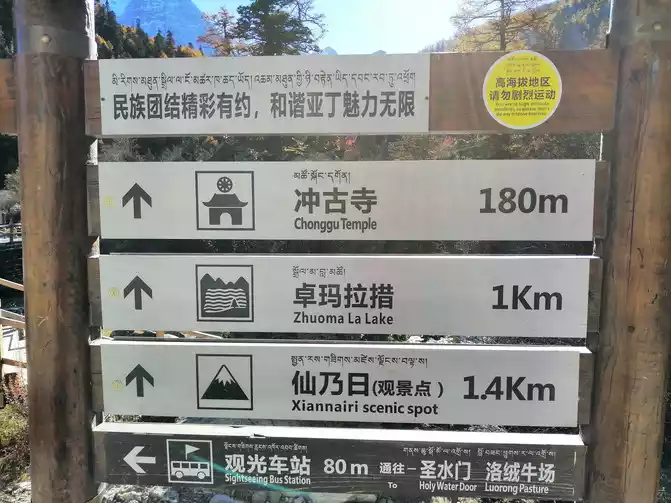 Take pictures, enjoy the scenery, go all the way up to Chonggu Temple, there are two lines in Chonggu Temple, the short line is to go to Xiannai Ri and the Pearl Sea, the long line is to go to milk and the five-color sea, the first day spent more time on the road, chose the short line, and have always had a sense of awe for the temple, we bypassed Chonggu Temple and walked up, full of golden paving, guiding us.