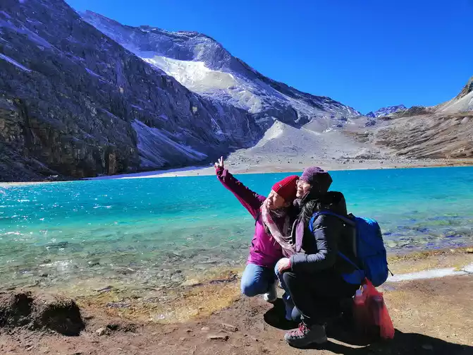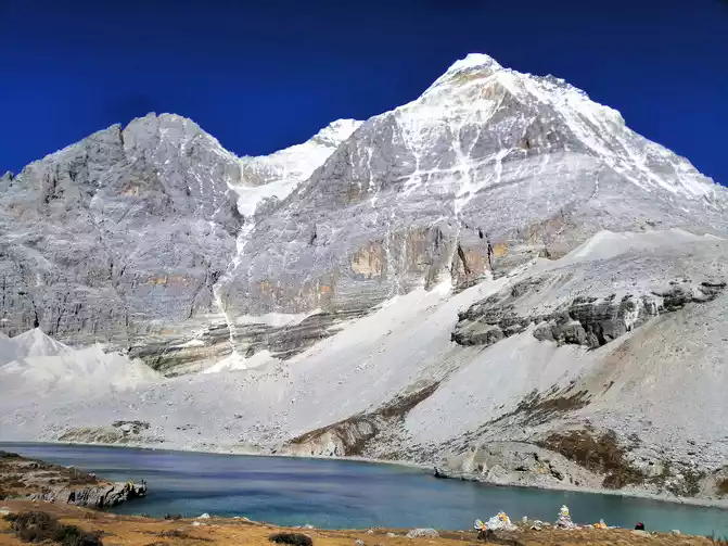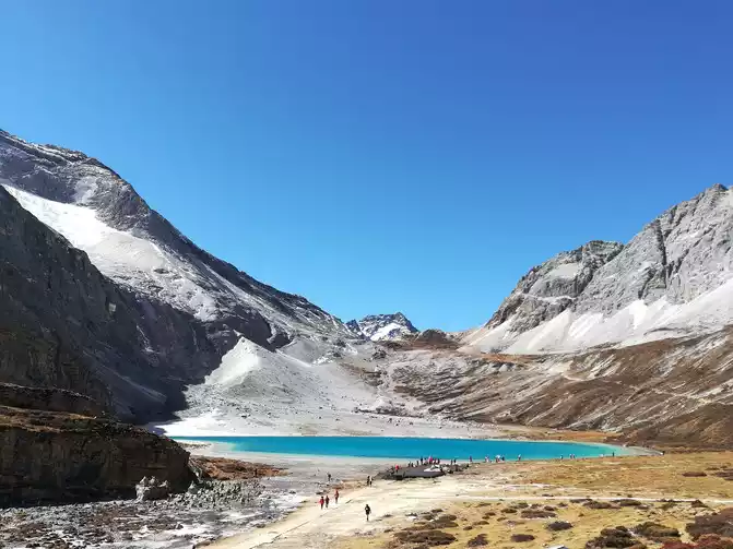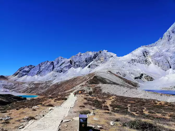 Touch the two bottles of oxygen in the backpack, start a difficult kilometer, stop and walk to breathe oxygen, this action is repeated many times and then to a fork in the road, here I carefully tell everyone, go to the left to the direction of the milk sea, the slope is gentle, the milk sea has finally arrived, the milk sea that shows its true face is so exquisite and smart, like a sapphire embedded in the snow-capped mountain nest, after ten thousand years.