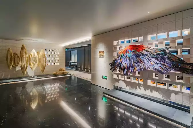 After checking in, before waiting for dinner, there is enough time to visit the entire hotel, the hotel is not simply to add regional culture from the appearance, but to integrate the entire Tibetan and Qiang characteristics into it, and the interior is permeated with local elements, such as the previously mentioned Zhongchagou means the place where the condor lands, and the theme inspiration of the hotel is like this, which is very local and modern.
