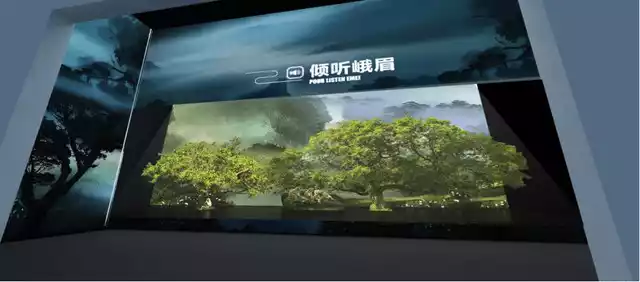 The opening "Listening to Emei" is very moving: the professional team spent dozens of days collecting the sound of wind, rain, flowing water, the sound of frogs playing the piano, the roar of flowing clouds, and the sound of falling snow on Mount Emei...... The unique Emei symphony is assembled, which is extremely beautiful. Then enter the mountain space composed of a screen to watch the ten traditional scenes in the "Eshan Illustrated Commentary" looming on the mountain, each story is 30 seconds. The ten scenic spots of Emei include the Holy Accumulation Evening Bell, Luofeng Qingyun, Lingyan Stacked Green, Shuangqiao Qingyin, Baishui Autumn Breeze, Hongchun Xiaoyu, Daping Jixue, Jiulao Xianfu, Xiangchi Night Moon, and Golden Dome Xiangguang, which will give people a deeper understanding of Mount Emei.