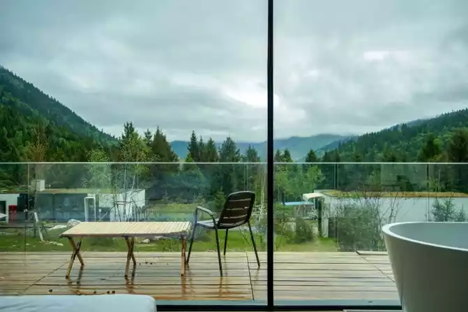 The tall floor-to-ceiling glass of the guest room overlooks the snow-capped mountains and trees, making it a truly beautiful room.