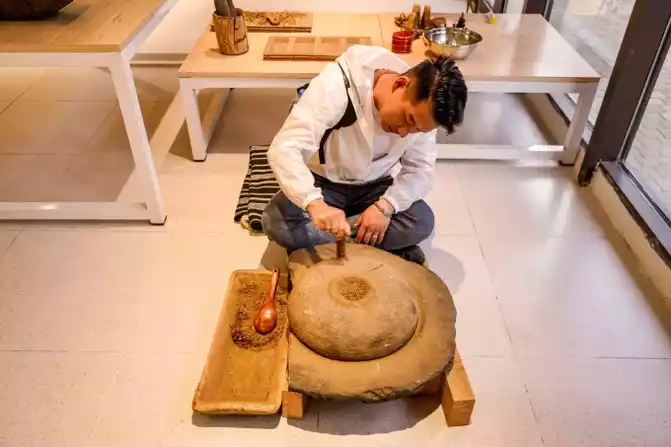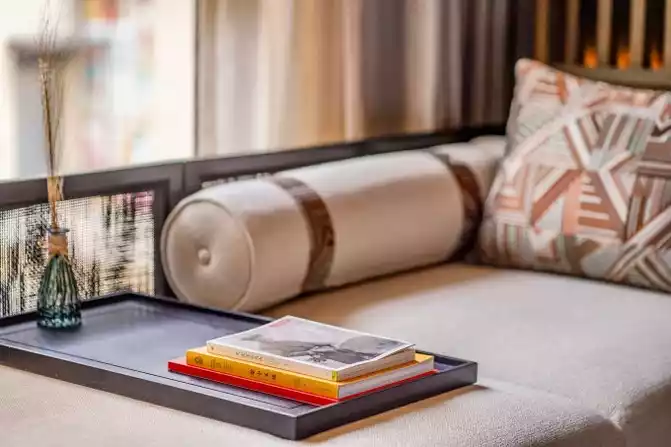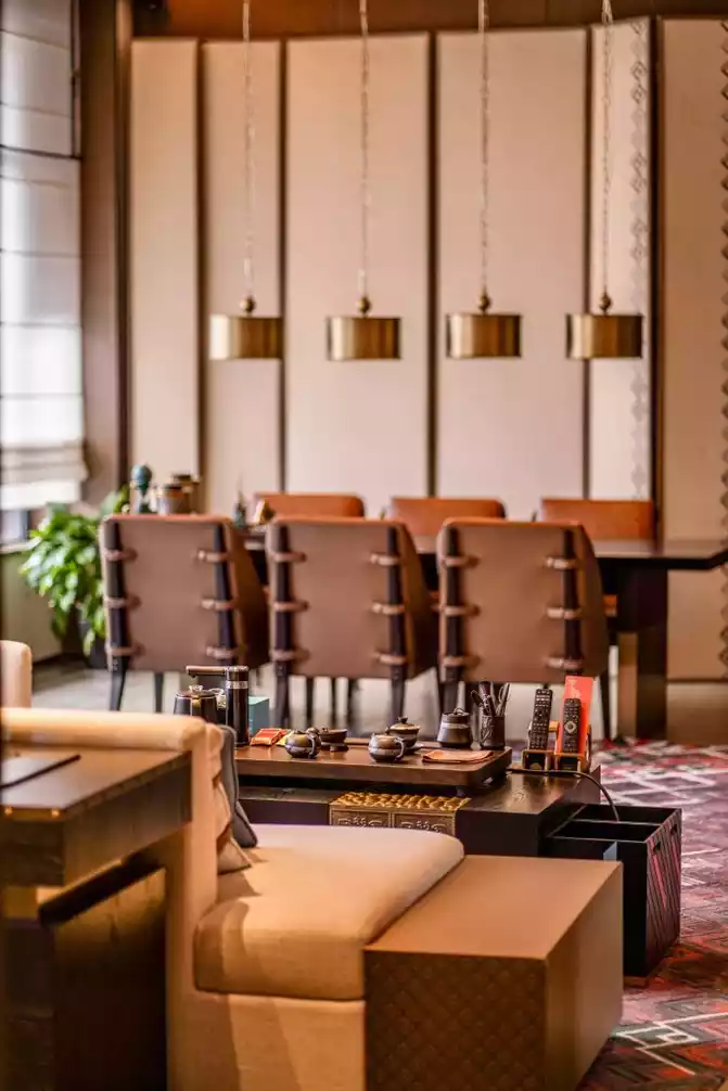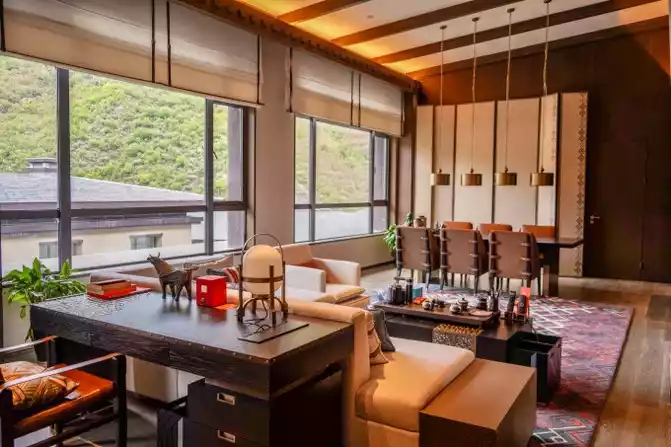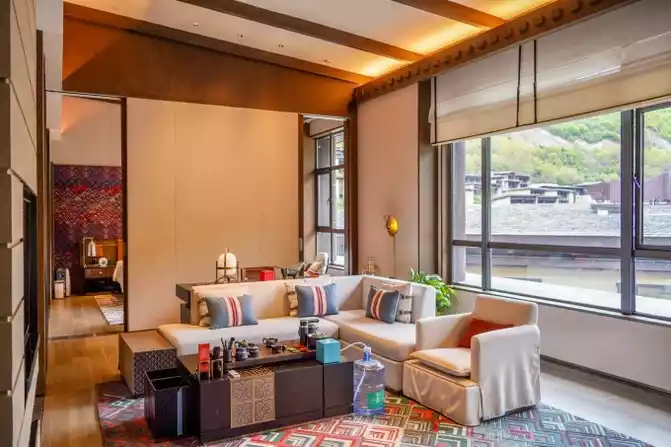 The color palette of the rooms is based on white and taupe, which is simple and modern with local colors and textures, reflecting a sense of luxury throughout. Even the tea sets are very Tibetan and Qiang.