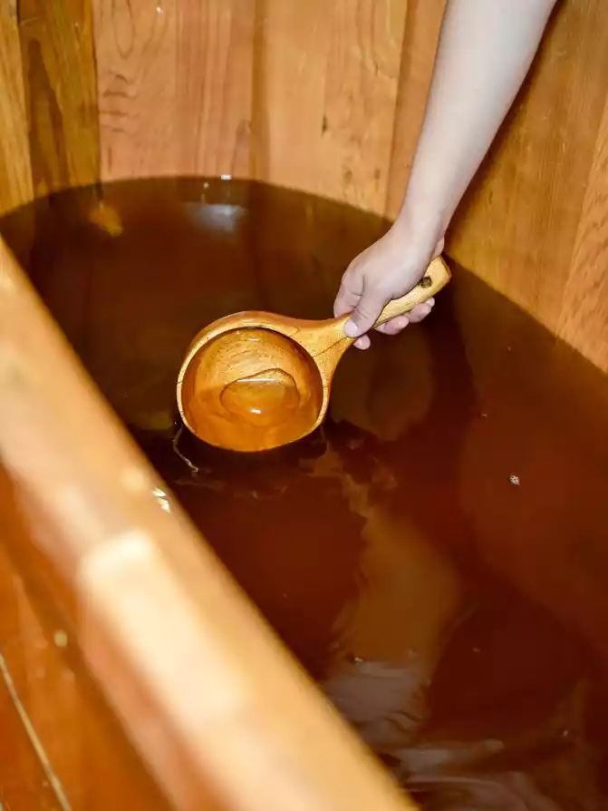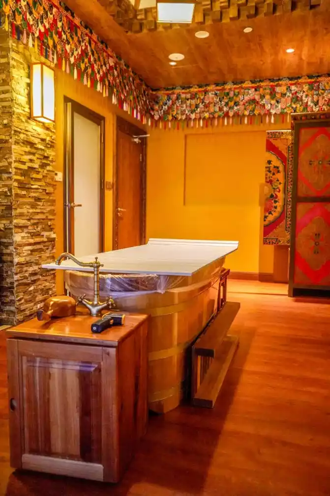 acupoint 6, entering the wooden bath bucket to experience the Tibetan bath