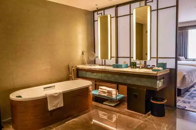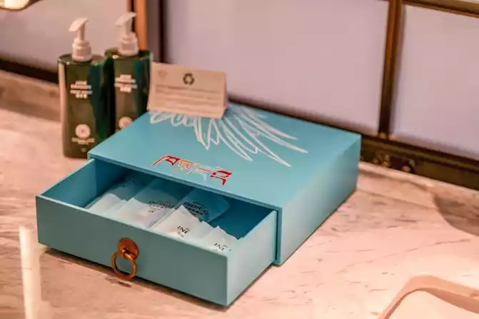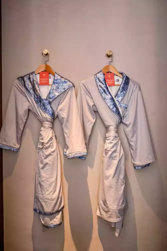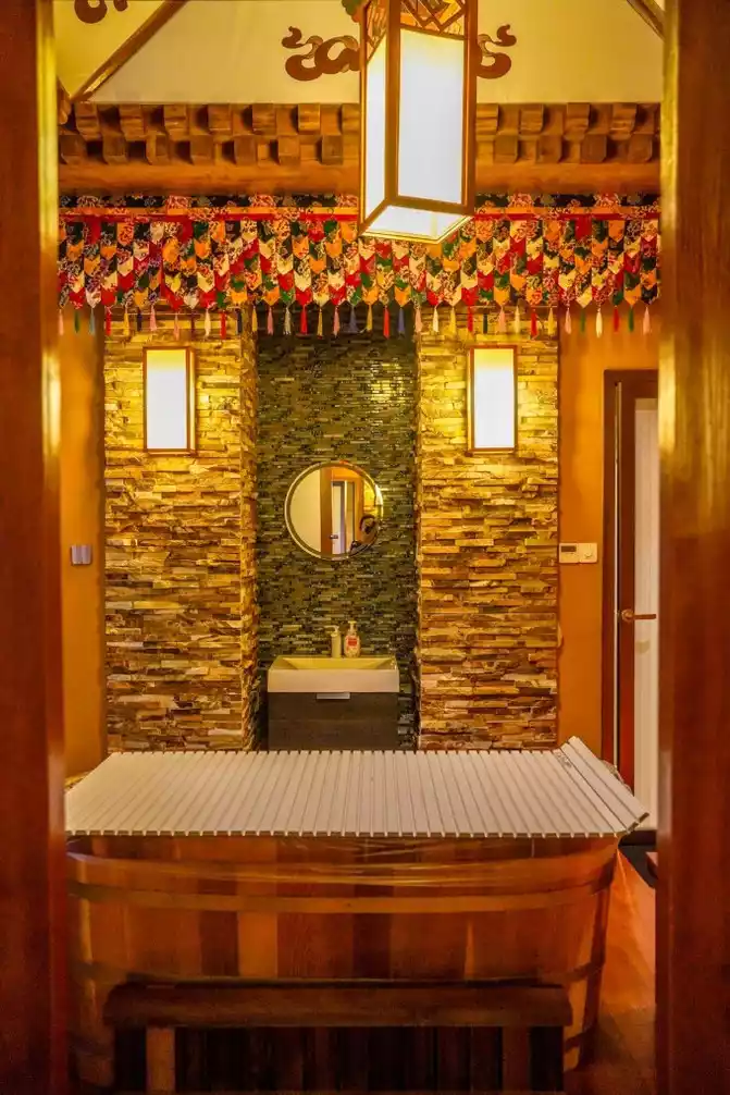 bathing space is separated from wet and dry, toiletries, toiletries boxes, soap pads, etc. are also designed with a strong Tibetan and Qiang style, and the bathrobes embellished with Tibetan and Qiang ethnic patterns are also very good-looking.