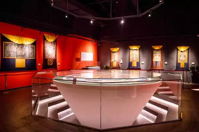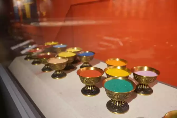 This is the treasure of the town hall: the colored sand mandala. The colored sand mandala is painted and originated from the traditional art of Tashilunpo Monastery in Shigatse City, Tibet Autonomous Region, China, and is one of the national intangible cultural heritages. The mandala originated from Indian Buddhist Tantra and is one of the objects of worship during the practice of Tibetan Buddhist Tantra. It is made of colorful sand grains piled up according to strict proportions, structure, content, etc., and after outlining the outline on the pedestal, it starts from the center, is alternated in a square and circle, and gradually spreads to the periphery. In addition to sand masonry, the mandala also has different production methods such as hand-painted and wood carving
