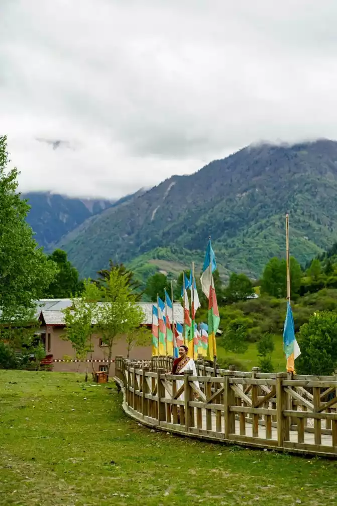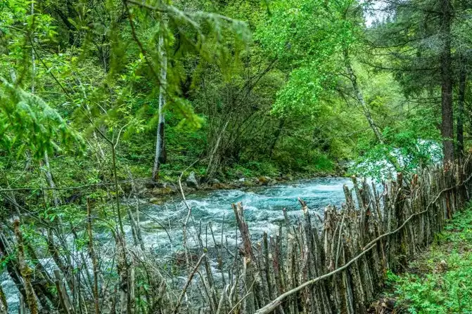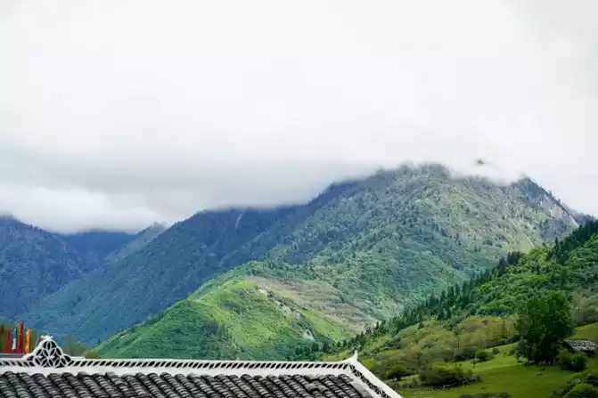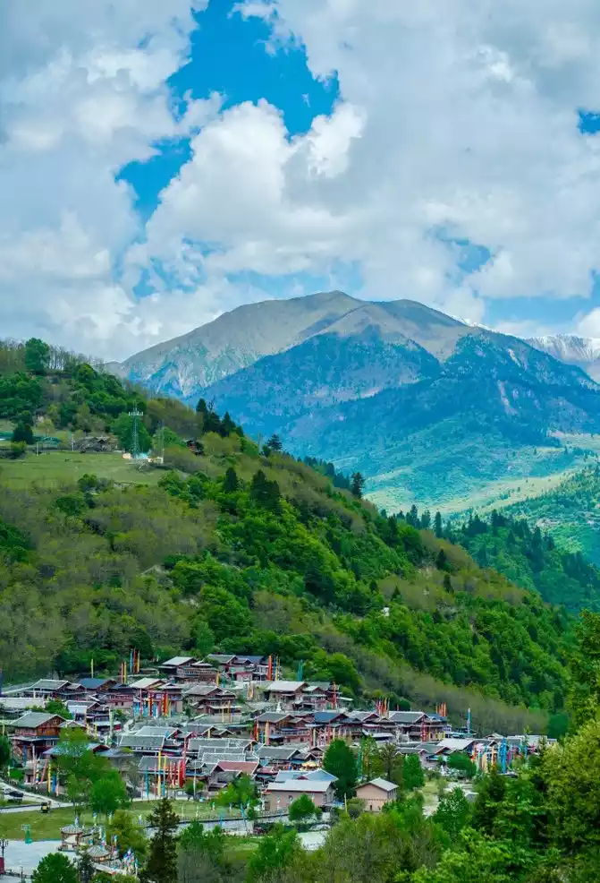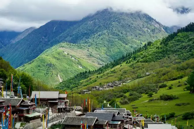 Zhongchagou is located in Zhangzha Town, the county county, separated from the Jiuzhaigou Scenic Area by only a mountain, is a canyon about 10 kilometers long and 3.5 kilometers wide, with an altitude of 2,189 meters at the mouth of the ditch and an altitude of about 4,000 meters above sea level on the top of the mountain, with extremely rich animal and plant resources. There is an ancient temple in white, and the Tibetan people have worshipped white since ancient times, because white symbolizes sincere and pure wishes, is a manifestation of whiteness and immaculateness, and colorful prayer flags spread out from the top of the tower.