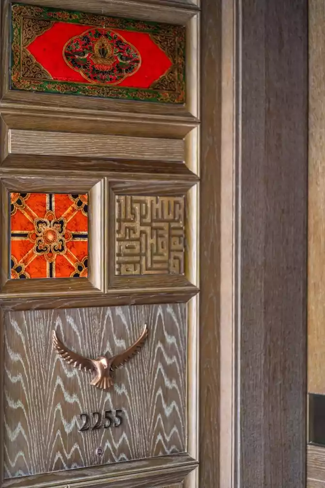 Zhongchagou, which means "the place where the divine eagle lands" in Tibetan, is the place where the "Dele" family was led by the divine eagle to settle down, and is a holy feng shui treasure land. According to legend, the mount of King Gesar, the hero of the Tibetan people, is a huge condor, soaring in the sky and patrolling the universe, and only the Baijian Mountain god here has the ability to carry the condor to land and rest, hence the name. Therefore, Hotel Indigo takes the "Condor" as the main line of inspiration, and the design of the Condor element can be seen at the gate, the background of the front desk, the elevator entrance on the floor and the door of the guest room.
