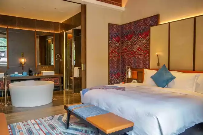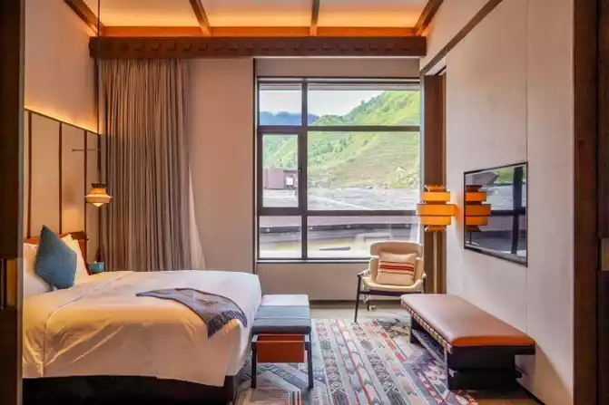 The entire Hotel Indigo Jiuzhai has 200 rooms and suites, and the details of the rooms can be seen in the form of traditional Qiang fabric embroidery and Aba Tibetan unique thangka paintings. The design of the bedside background wall of the guest room is mainly decorated with Tibetan and Qiang costume totems, with unique patterns, rich colors, and a design full of national culture to bring a different visual impact.
